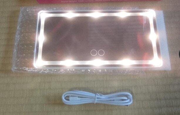 車に付いているサンバイザーミラーが小さく不満でしたので注文しました。 製品は無段調光機能を搭載しています。 ◯部分をタッチすると光ります。 タッチの長押しで明るさを自由に調整できます。 ライトは3種類です。 かなり明るく、鏡が大きいです。 注文して大満足です。